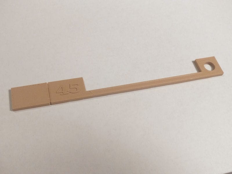 Flyygelin lyöntivälimitta. Mittaava osa 45mm, puolivälimerkillä. Lyhyempi pää 15mm (koppaus). Lyöntivälimittaa saatavilla pituudet 44, 45, 46 ja 47mm.